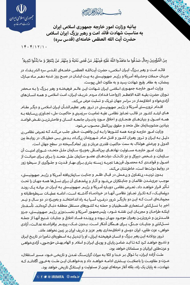 بیانیه به مناسبت شهادت رهبر بزرگ ایران اسلامی، حضرت آیتالله العظمی خامنهای