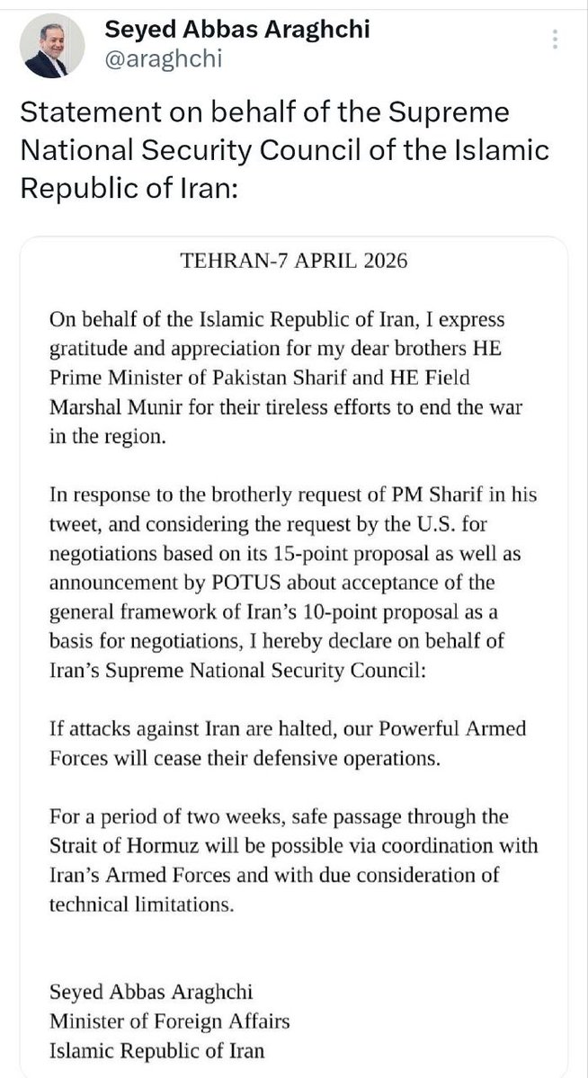 در پاسخ به درخواست برادرانه نخست وزیر پاکستان مندرج در توییت ایشان، و با توجه به درخواست آمریکا برای مذاکره در پیشنهادات ۱۵ بندی آن کشور، و اعلام رئیس جمهور آمریکا مبنی بر پذیرش کلیات پیشنهادات ۱۰ بندی ایران به عنوان مبنای مذاکره، بدینوسیله از طرف شورای عالی امنیت ملی ایران اعلام می‌کنم: